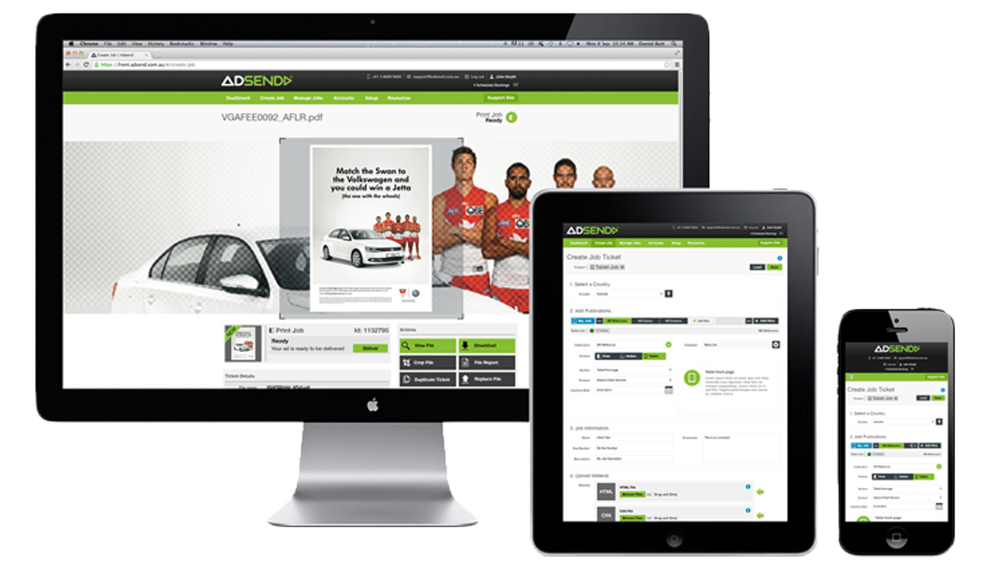 Adsend is an easy to use, cloud based service and simply requires login credentials to access the platform. New users can crate and account on-line (see below) and Adsend requires no software to be installed on the users computer(s). Adsend provides both the sender and publisher a complete range of tools to ensure the efficient processing of files through the system including automated correction and optimisation of users files to help ensure perfect print every time.